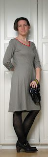 Die einzige Änderung war die, die ich immer mache (außer bei Burda-Schnitten): ich gebe 1 cm in der Schulter dazu. Ach, und etwas gekürzt habe ich es auch, weil die Knielänge von Schnitt bei mir eine Überknielänge ergab und die mag ich nicht an mir.