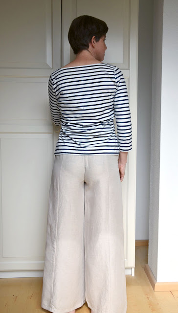 Im Juni nähte ich mir in der Annahme, wir bekämen einen sommerlichen Sommer, eine Sommerhose aus einem Leinenmischgewebe. Sie begleitete mich auch in den Urlaub und war mit mir an der Ostsee und an der Elbe, wo ich sie immerhin einmal getragen habe. Ein zweites Mal noch, als wir gerade wieder zu Hause waren. Seit dem friere ich tendenziell und habe schon mal meinen Vorrat an Wollstoffen gesichtet... Alternativ wäre eine Regenjacke allerdings auch gerade ein passendes Nähprojekt. Mal sehen... Ich tue heute aber mal so, als wäre SOMMER und zeige euch die Hose: